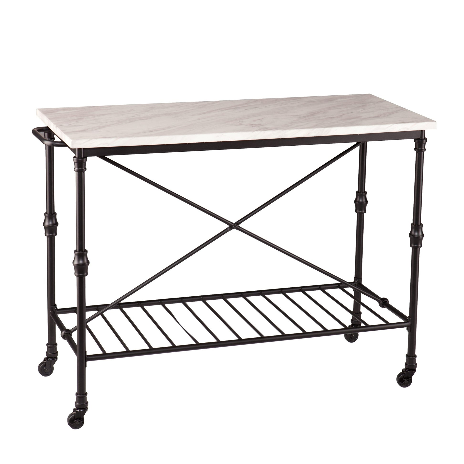 This black and white 49-inch rolling kitchen island with storage marks the beginning of a new era for kitchen decor. This durable manufactured wood and faux marble, rectangular island frees up a tremendous amount of space in your kitchen area, allowing you more flexibility as you prepare meals or serve guests. This unit features purposeful distressing for a slightly rustic and vintage design styling. You can keep everything you need within reach with the conveniently included towel rack. Enhance the beauty and functionality of your kitchen space with this multi-purpose kitchen island. 34.25-inch H x 48.5-inch W x 21-inch D