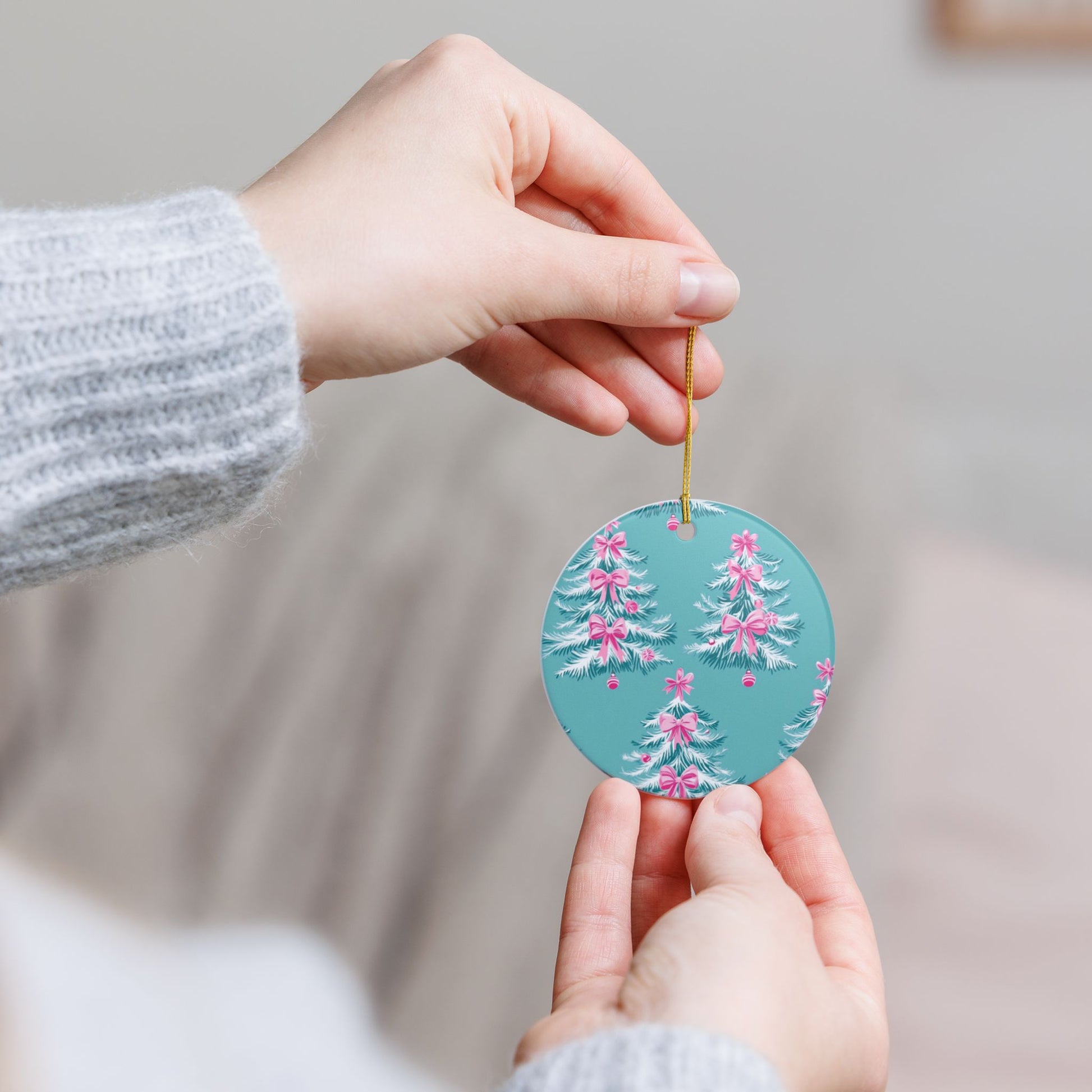 Christmas Tree Ceramic Ornament, Holiday Decoration, Festive Gift, Tree Decoration, Pink Bow Ornament, Seasonal Decor
